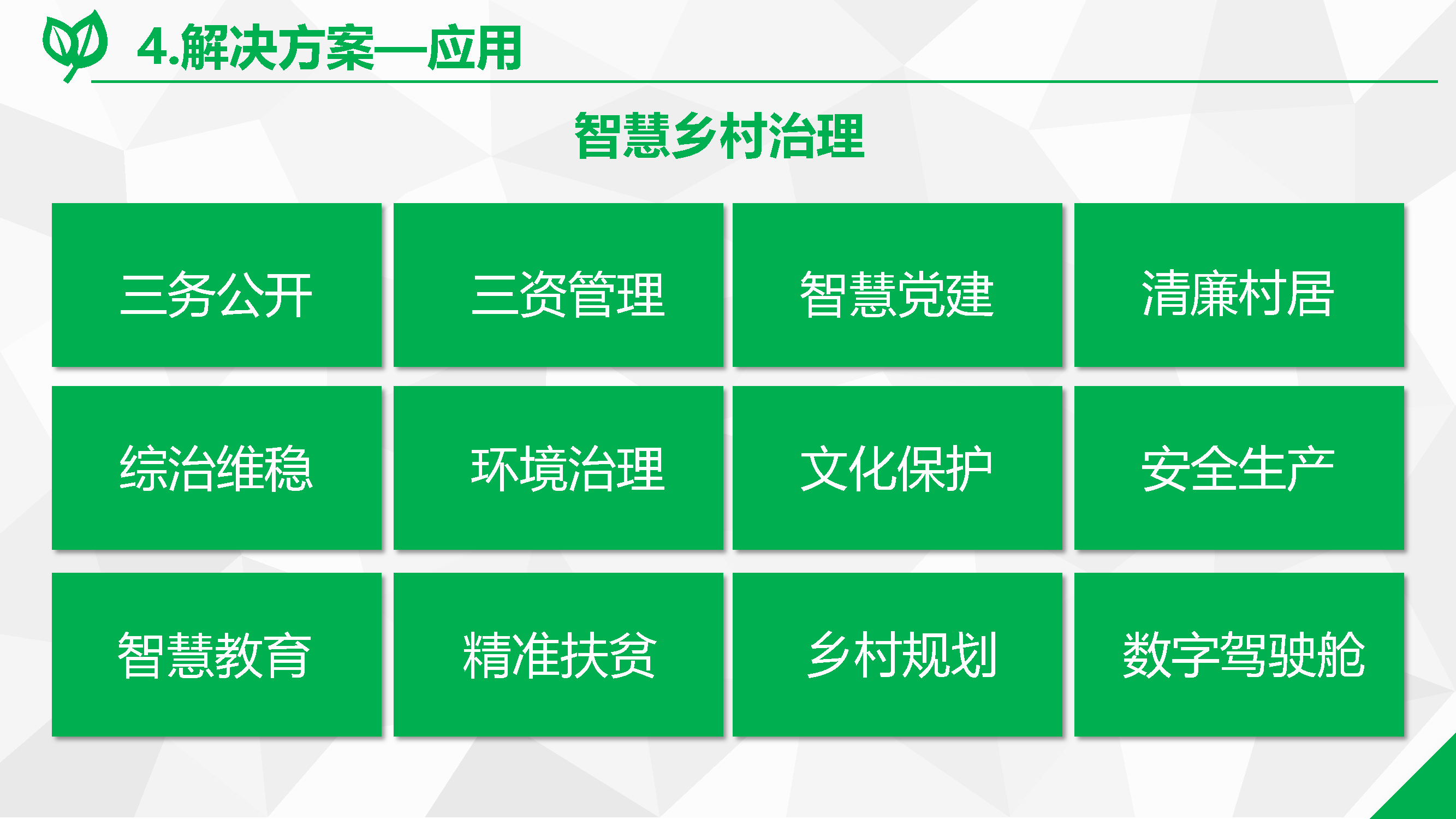 根據(jù)鄉(xiāng)村振興戰(zhàn)略的總體部署,鄉(xiāng)村治理工作應(yīng)著重提升智能化、精細(xì)化與專業(yè)化水平。因此,結(jié)合自身的數(shù)字化應(yīng)用開(kāi)發(fā)能力,聚焦智慧黨建、村鎮(zhèn)環(huán)境保護(hù),以及城鎮(zhèn)綜合行政執(zhí)法工作的數(shù)字化,為縣域建立健全數(shù)字治理新模式提供支撐。